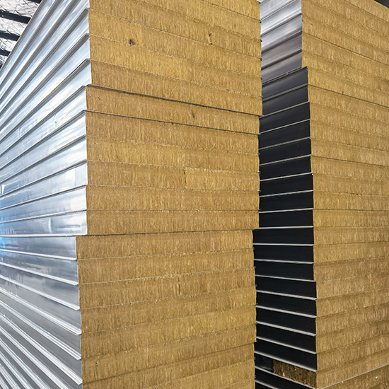 巖棉彩鋼夾芯板其芯材是以玄武巖及其它天然礦石等為主要原料,經高溫熔融成纖維,加入適量粘結劑,固化加工而制成的。是同類(夾芯板系列)中耐火性能最強的一種新型防火板材。